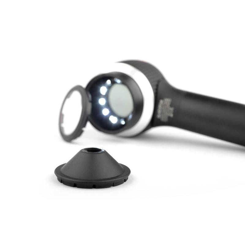This contact plate's compact 10 mm diameter allows for contact dermoscopy of concave body regions and crevices with immersion fluids. Contains a 4x4 mm hairline reticle and is compatible with any DermLite DL4 model that has a snap-on (non-magnetic) faceplate.